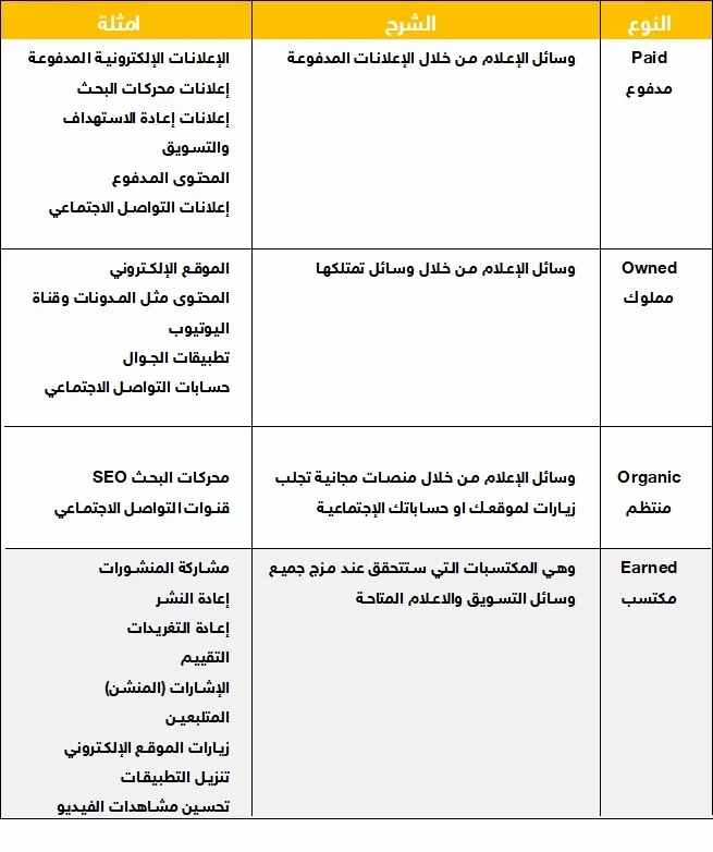 ولكي تحقق أفضل النتائج فلا بد من استخدام جميع عناصرالتسويق الالكتروني والاعلام المتاحة مابين المدفوعة و المملوكة و المنتظمة حتى تخرج بمكتسبات كبيرة